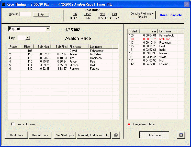 announce the racers’ names, current place, and split times during